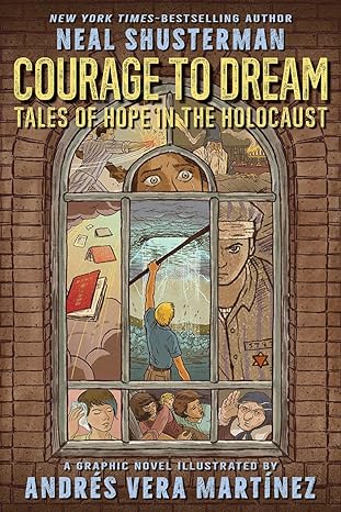 The themes of resistance, survival, and hope in times of crisis tightly connect these tales of magical realism. Shusterman’s objective in writing this anthology was to shine a light upon evil in the recent wave of anti-Semitism and Holocaust denial. He achieves this by eloquently intertwining Jewish and Eastern European folktales into the stories. The mystical objects and magical beings in these traditional tales are symbols, according to Schusterman, of “hope, survival, and collective grief” (p. 246) in the face of harsh realities. Andres Vera Martinez states in the end notes that the illustrations were created to engage a younger audience and influenced by Marvel comics he read as a child. Martinez perfectly channels both the superpowers and humanity of Marvel characters into the main characters of this graphic novel with every bash, crash, and smash. He creates an old world feel with his muted color palette and light brown pages in this advanced readers copy. An extensive bibliography and note on the Hebrew letters included throughout the book are thoughtful additions. Courage to Dream successfully weaves atrocious narratives with striking images of history and legend to warn us about what happens when authorities sanction violence and hate.