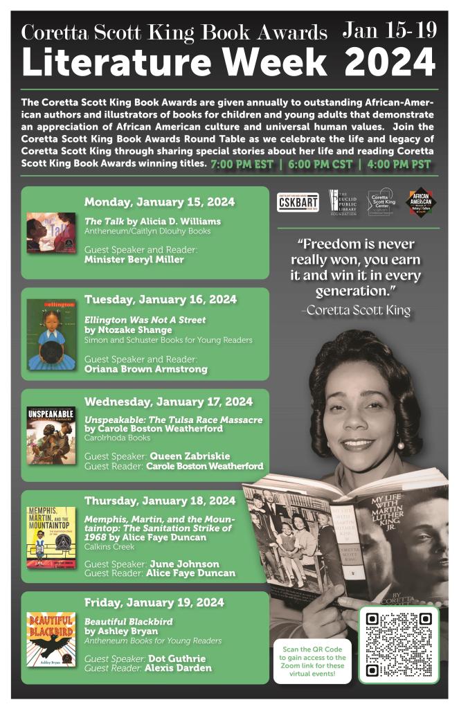 The Coretta Scott King Book Awards are given each year to African American authors and illustrators of children’s and young adult books. Join the ALA’s Coretta Scott King Round Tables and their guest speakers and readers celebrating the life and legacy of Coretta Scott King, African American culture, and universal human values. Scan the QR code to be admitted to these virtual events on January 15-19, 2024 at 7:00 PM EST.