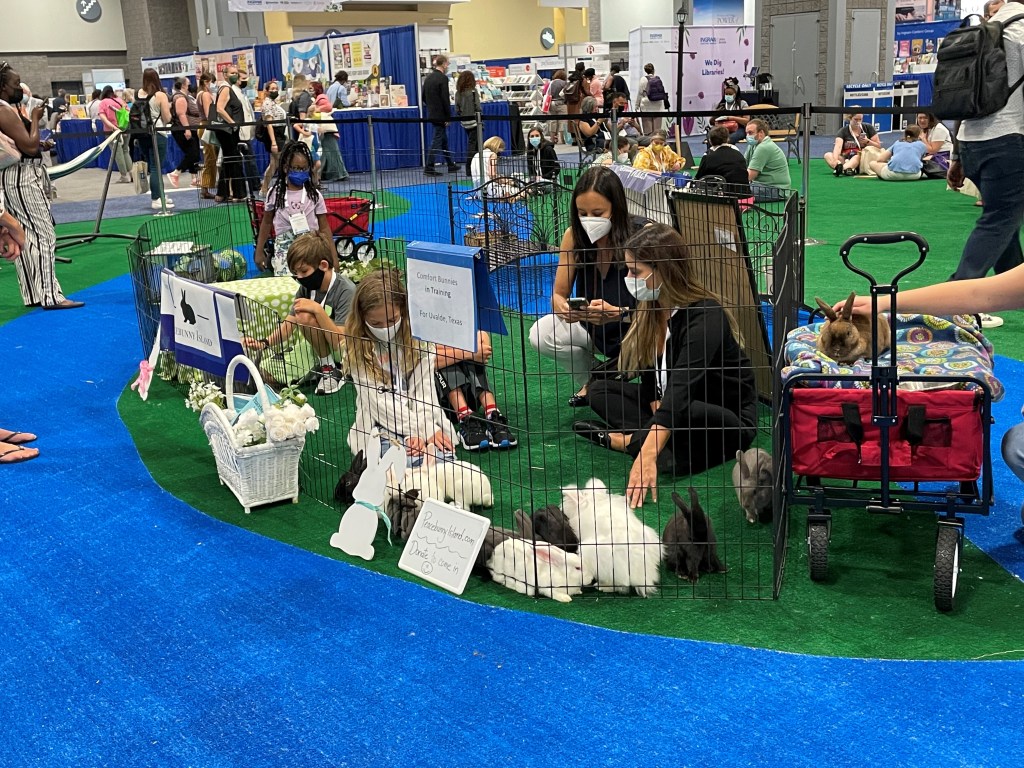 Jen: This year was an excellent opportunity to reconnect with the generous publishers that contribute to the BCLC review collection and thank them for their continued support. And, as always, a chance to get a sneak peek at what is coming up for the book world and our shelves. Keep an eye open for Maya’s Song by Butler Lecture alumni Renèe Watson and Bryan Collier. Perhaps my favorite part of this year’s hall was the bunny petting zone! For a donation to Peace Bunny Island (check out their site for info and their book), attendees could take their turn cuddling the comfort bunnies in training. This graduating class of bunnies was bound for kids in Uvalde, TX.