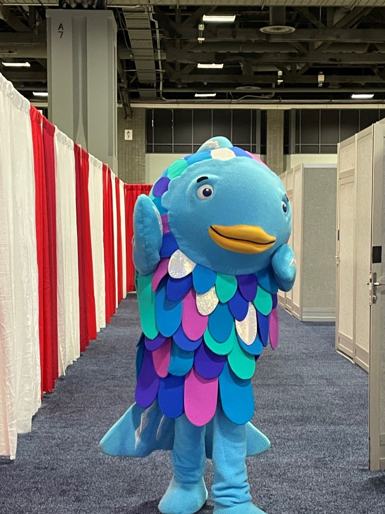 Jen: I had my obligatory Jason Reynolds sighting (3 conferences in a row and I am NOT complaining about this) while walking into the convention center on Saturday. And, of course, he was as lovely and gracious as always while people stopped him to profess their love and appreciation of his work. I didn’t snap his pic, but got one of Rainbow Fish on his 30th anniversary.